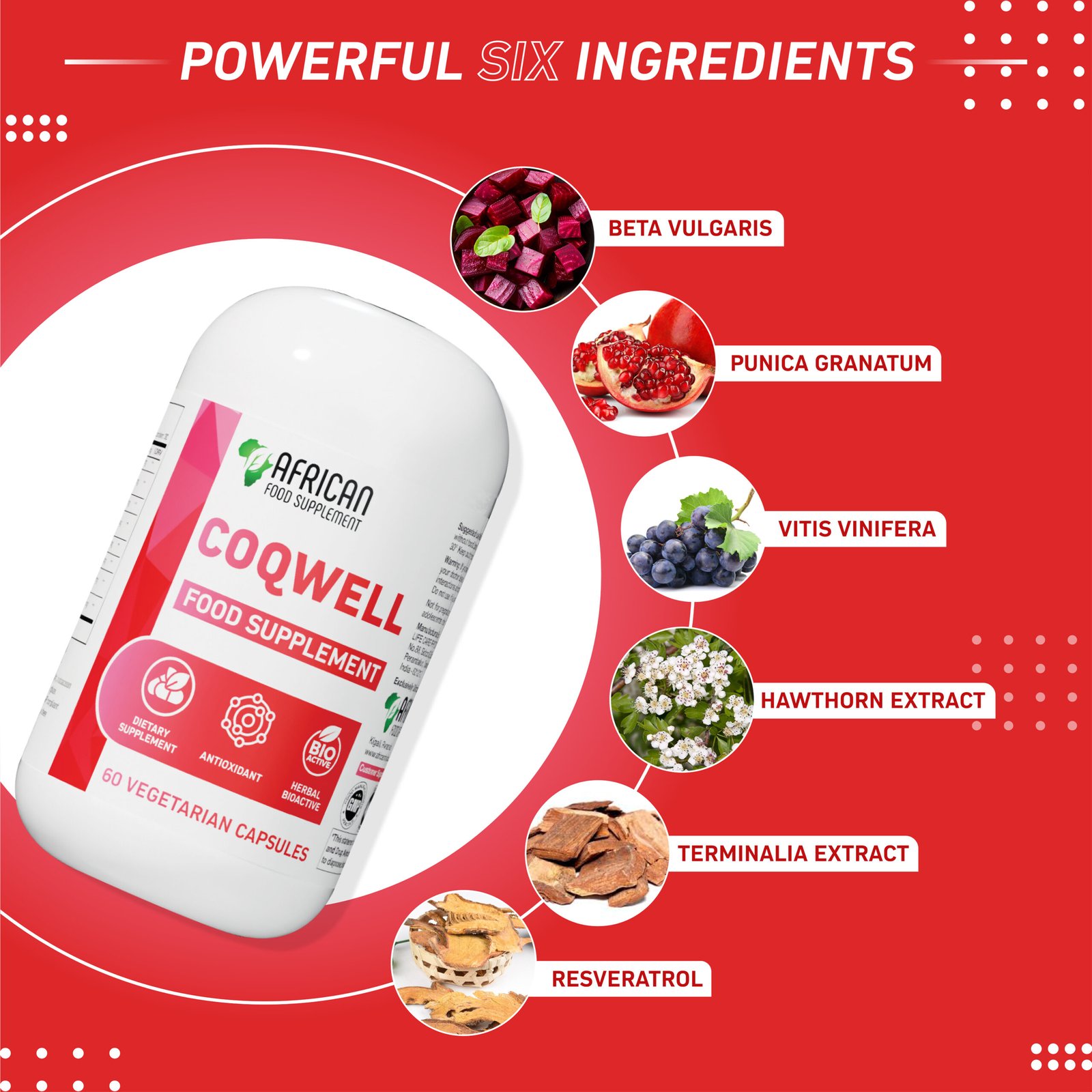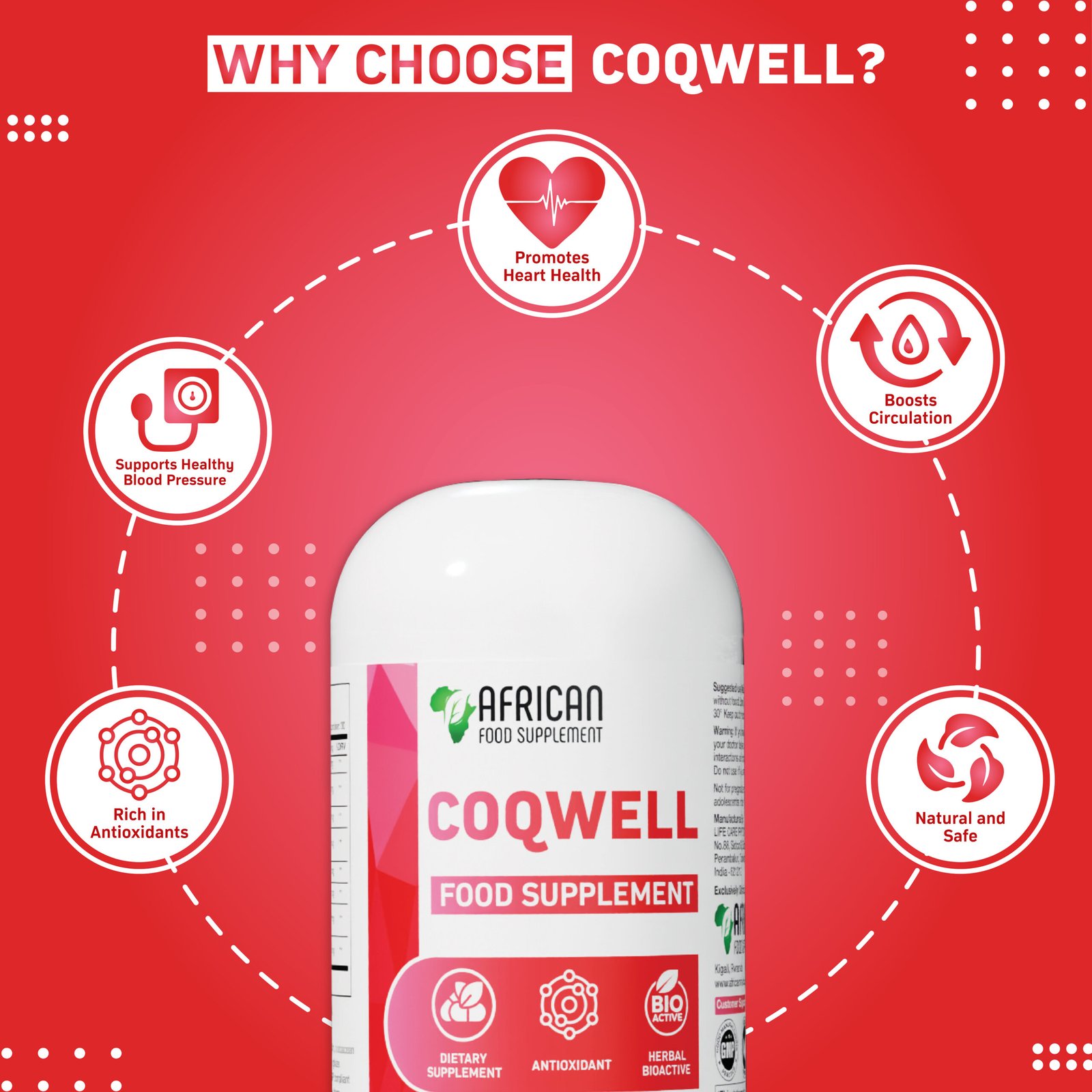 Introducing Coqwell, a cutting-edge African food supplement formulated to support heart health and maintain healthy blood pressure levels. Crafted with powerful, natural ingredients, Coqwell is your trusted companion for cardiovascular wellness, helping you live a heart-healthy life.
