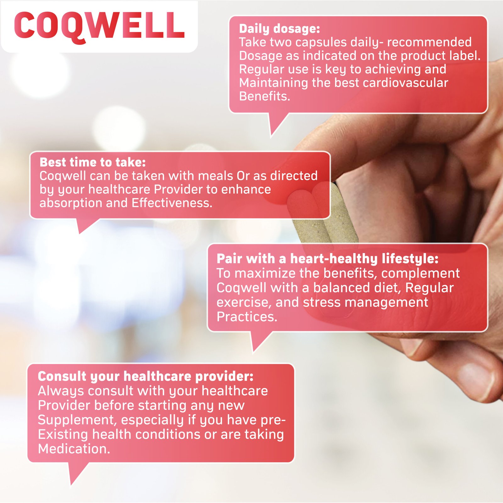 3. Pair with a heart-healthy lifestyle: To maximize the benefits, complement Coqwell with a balanced diet, Regular exercise, and stress management Practices.