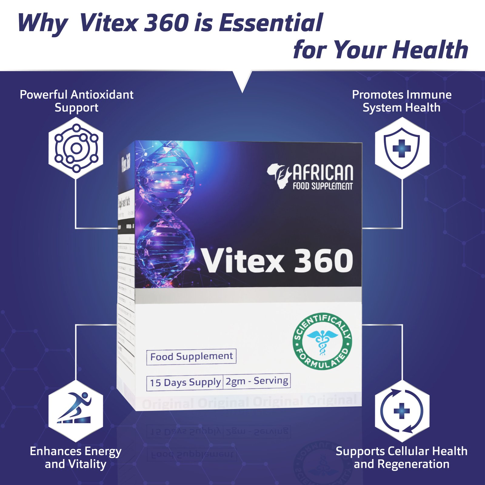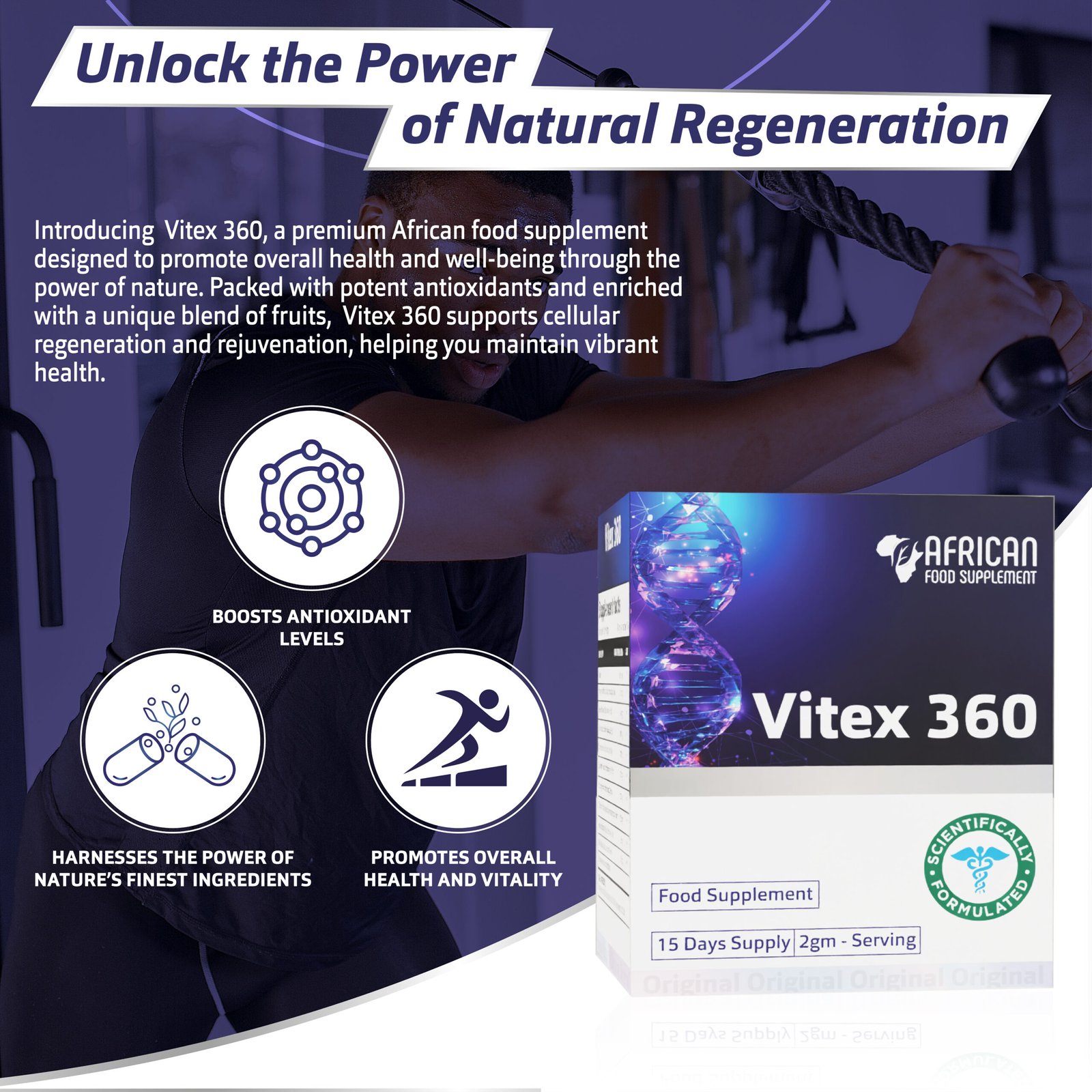 Introducing Vitex 360, a premium African food supplement designed to promote overall health and well-being through the power of nature. Packed with potent antioxidants and enriched with a unique blend of fruits, Vitex 360 supports cellular regeneration and rejuvenation, helping you maintain vibrant health.